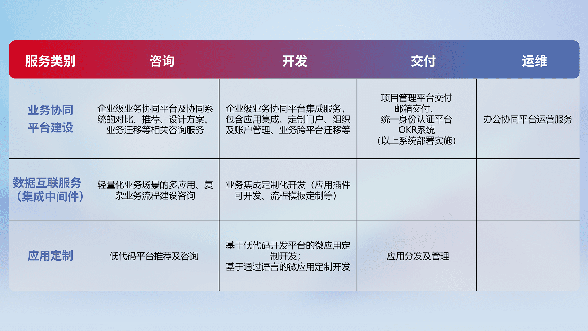 针对钉钉、、、企微、、IDaas等平台级产品提供产品的规划、、方案、、、、交付、、、、定制化开发等服务,,,实现如统一协同办公、、、智能客户服务、、、、混合会议管理、、、智能数据查询、、、等业务场景,,,实现数字化转型。。。